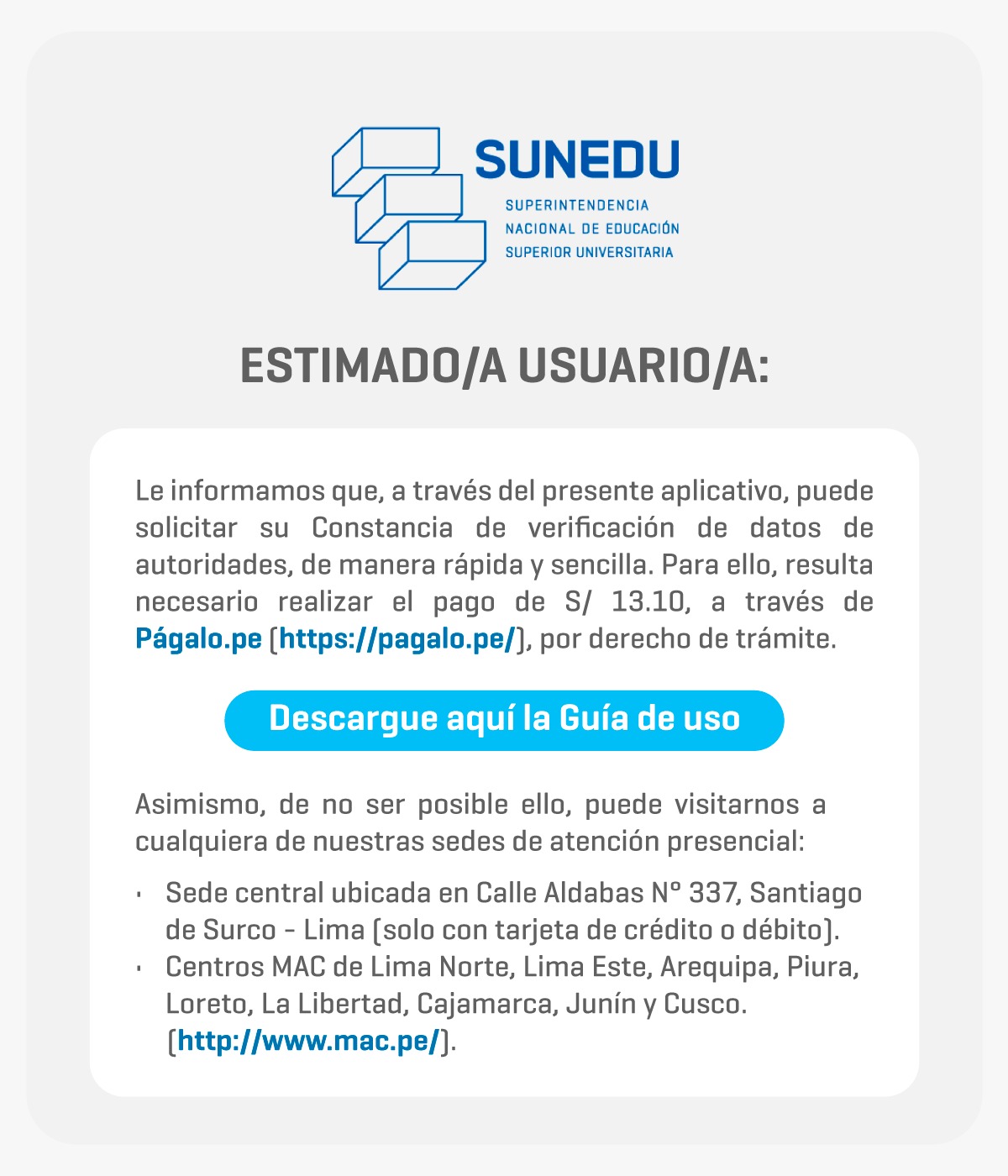 Atención. Conoce aquí cómo obtener la constancia de manera presencial: https://www.sunedu.gob.pe/emision-constancia-verificacion/.